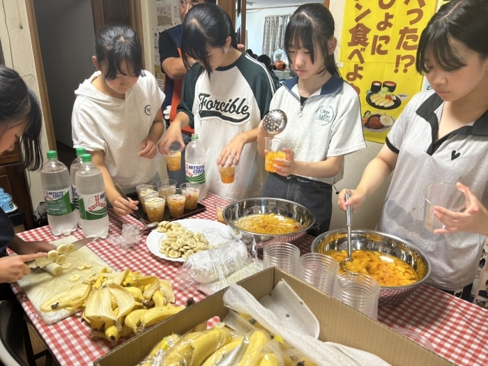 暑い中たっぷり遊んだ子どもたち。屋内に戻って、協力し合っておやつを作ります。メニューはフルーツパンチとプリンアラモード。いただいたアイスも入れて、ひんやりしゅわしゅわ、遊んだ後のおやつは格別です。
