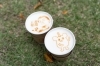 ヴァイレア選手と、まいぷれ江戸川区のキャラクター「江チュード」のラテアート