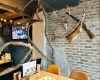 入口手前にあるテーブル席の付近には、鹿の剥製や銃のレプリカなどが飾られていてワイルド。